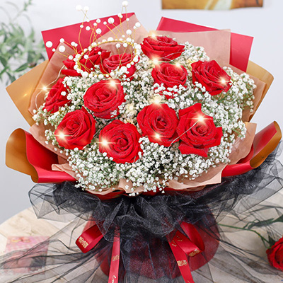 【脉脉含情】11朵红玫瑰,1条灯带,1个皇冠(样式随机),搭配满天星、尤加利叶装饰。