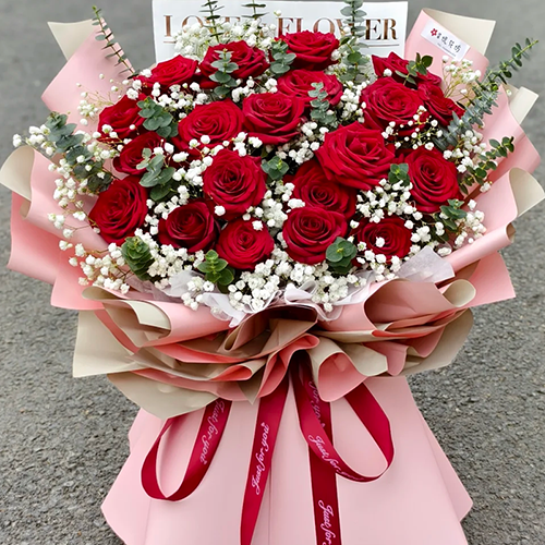 【浓浓深情】精选11朵粉玫瑰、8支洋桔梗(断货则用8支白玫瑰代替),尤加利叶、洋甘菊装饰。