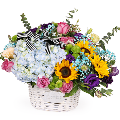 • 【夏日花园】9支精品紫玫瑰、1支蓝色绣球、3支向日葵、4支多头紫色洋桔梗、2支香槟色洋桔梗,搭配蓝色满天星、绿色小雏菊、尤加利叶,一朵蝴蝶结装饰花面。