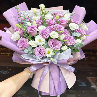 • 【紫色心情】精选19朵紫霞仙子紫玫瑰,6支多头浅色洋桔梗,搭配尤加利叶装饰。