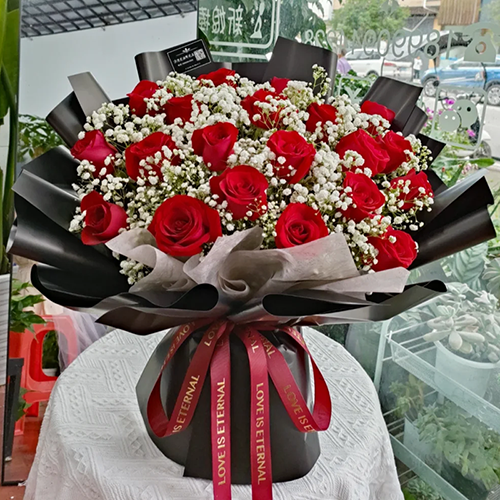• 【挚爱的你】33支精品红玫瑰,搭配相思梅(或白色满天星)丰满环绕。