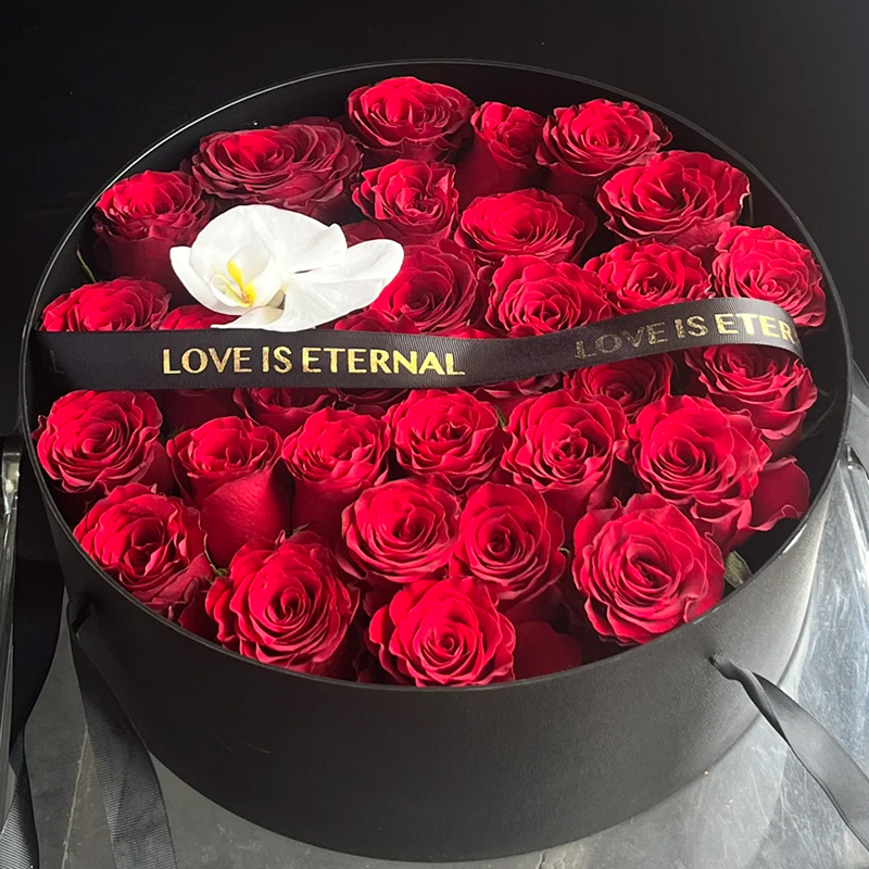 花材: 精选33枝红玫瑰,1朵蝴蝶兰,黑色英文缎带装饰花面。