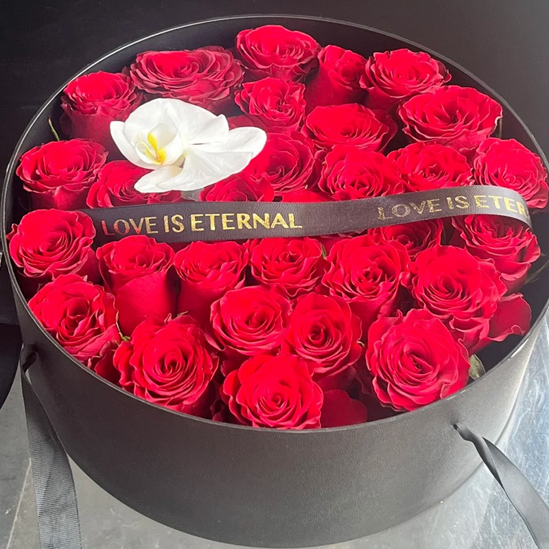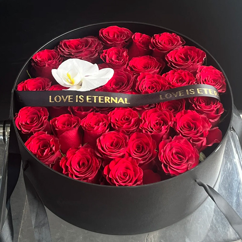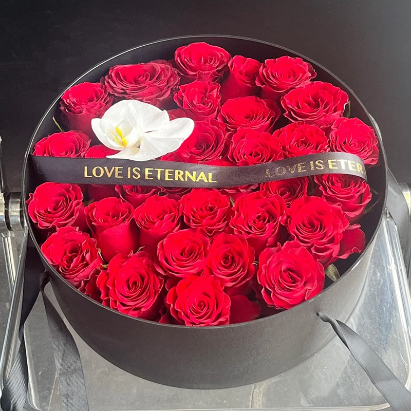 花 材:精选33枝红玫瑰,1朵蝴蝶兰,黑色英文缎带装饰花面。