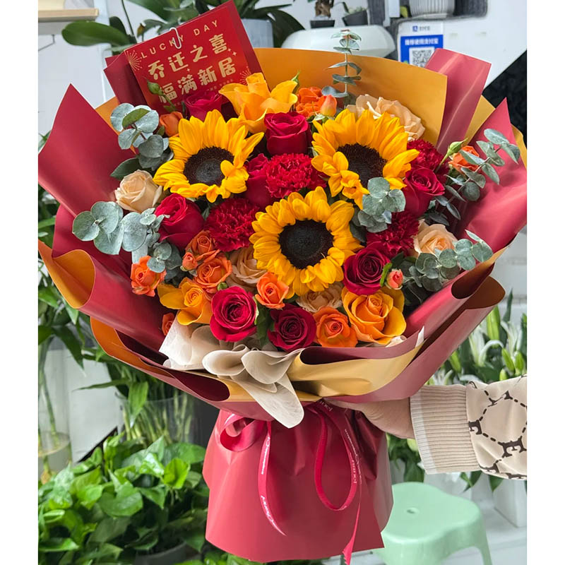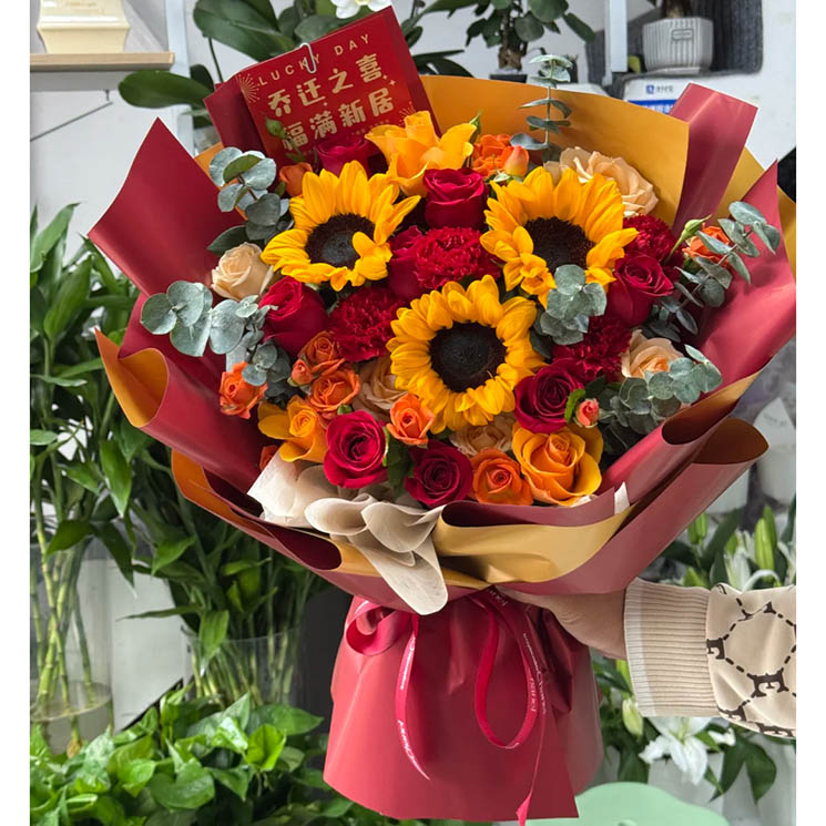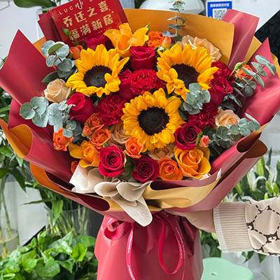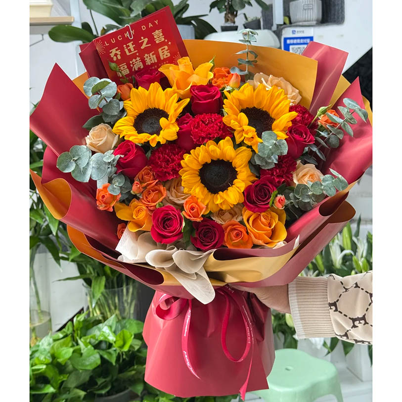 花材: 精选3枝向日葵,19朵玫瑰康乃馨混搭(红玫瑰和红色康乃馨为主,金辉玫瑰、香槟玫瑰),5枝多头橙色泡泡,搭配尤加利叶装饰。
