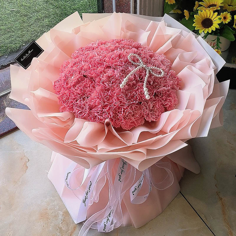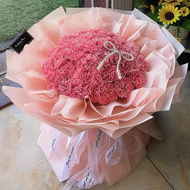 花 材:33支粉色康乃馨,搭配1条珠串蝴蝶结装饰。