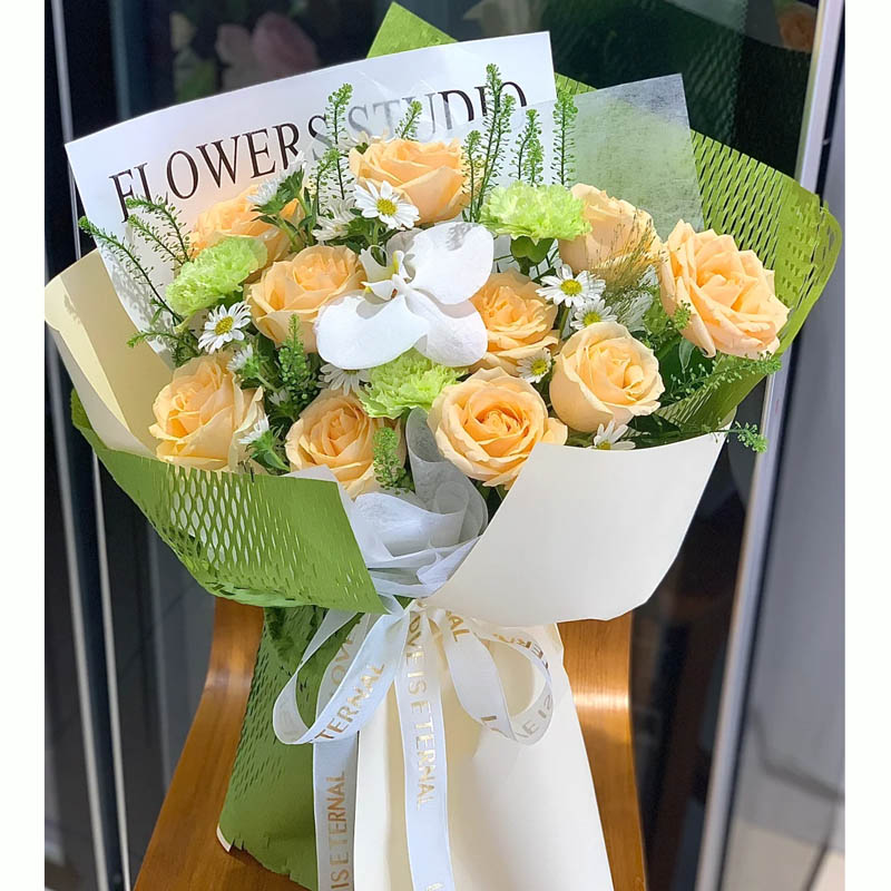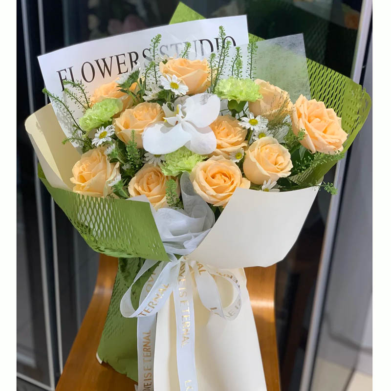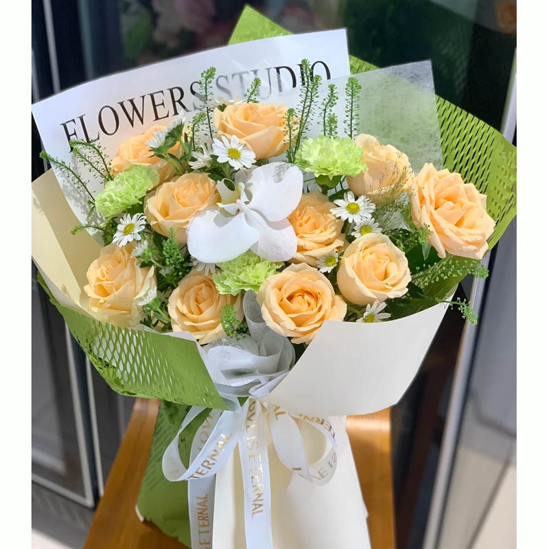 花材: 10枝香槟玫瑰,1朵白色蝴蝶兰,3支绿色康乃馨,搭配绿铃草,白色小雏菊丰满间插