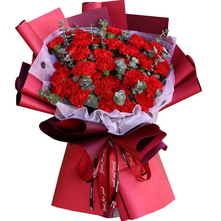 花 材:33朵精品康乃馨,搭配尤加利叶装饰。