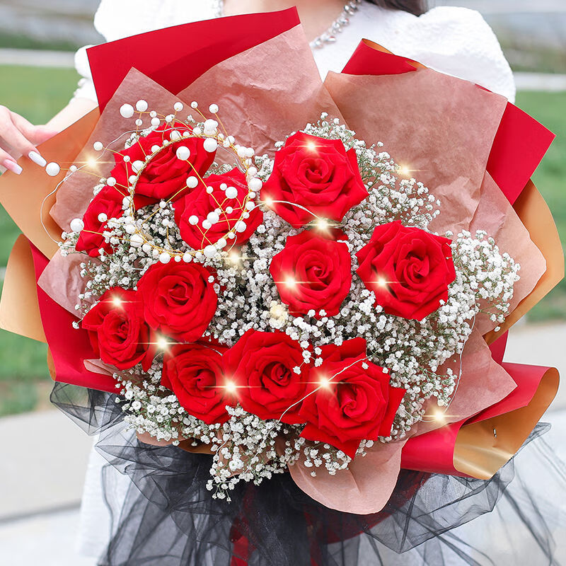 花 材:11枝红玫瑰,1个珍珠皇冠(款式随机),1条串灯,搭配白色满天星。