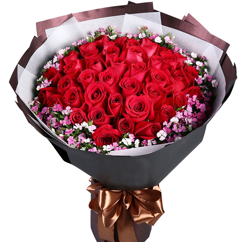 花 材:33朵红玫瑰,搭配石竹梅外围点缀。
