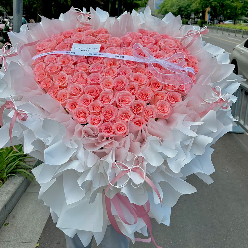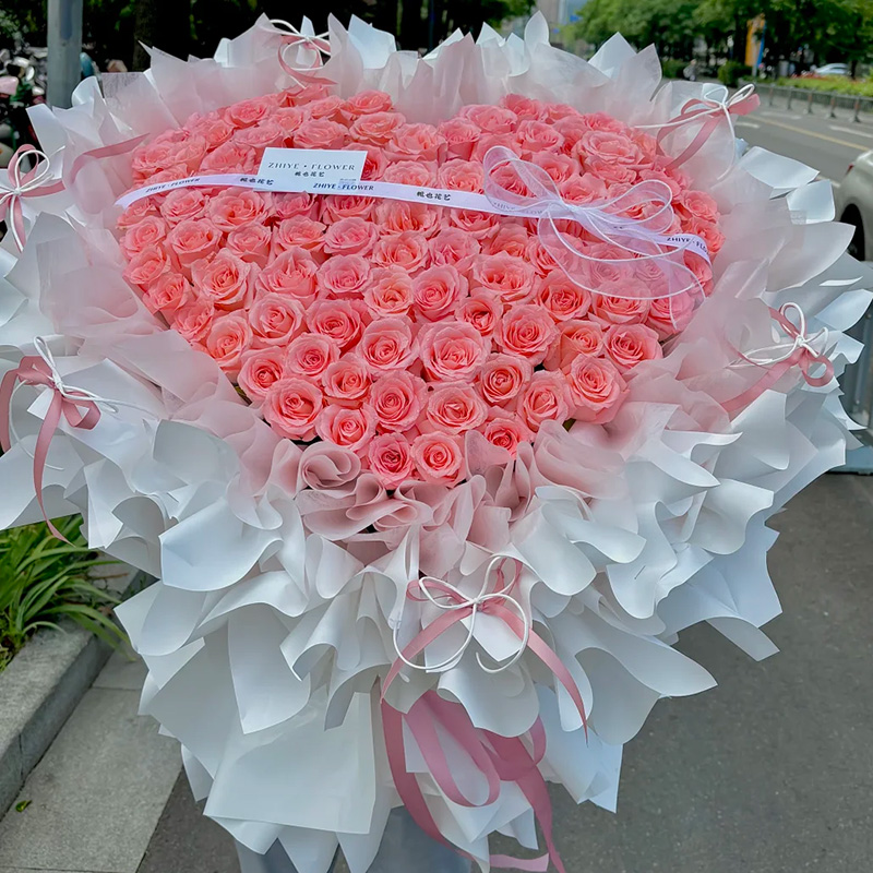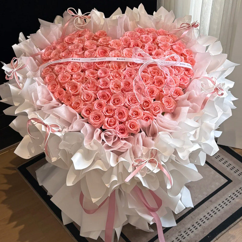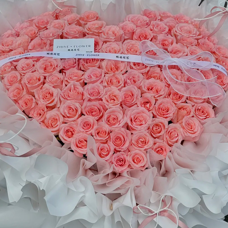 花 材:99朵戴安娜粉玫瑰,心形造型,搭配1条白色英文缎带装饰花面。