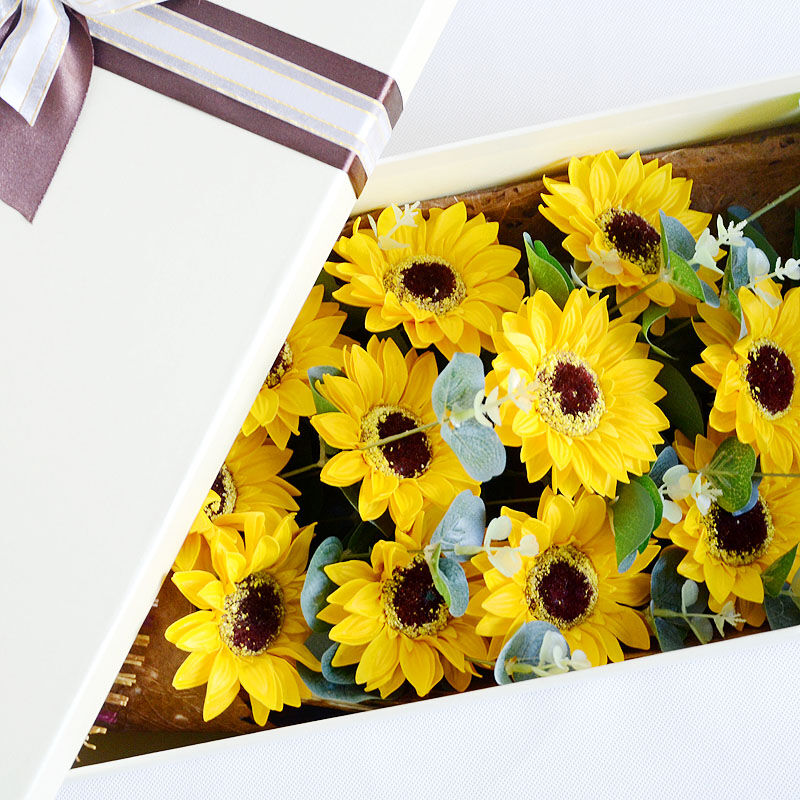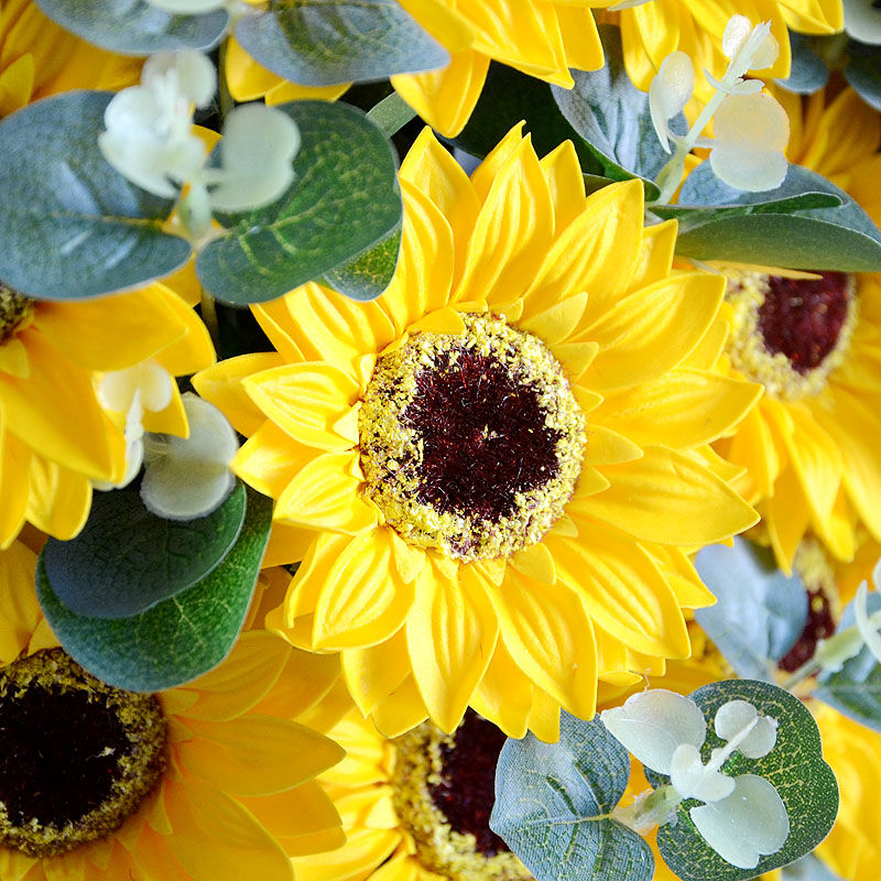 - 花材精选11支向日葵,搭配尤加利叶装饰。